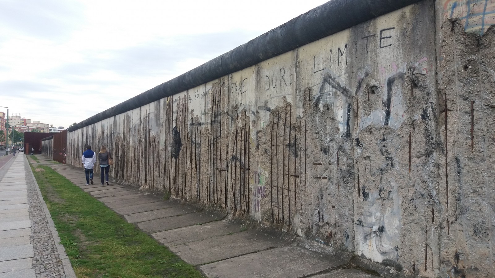 A few minutes walk from the watchtower on Erna Berger Strasse looms a 200m long section of the outer Berlin Wall. Each section was made of pre-cast concrete used by farmers to build open silos. It was 3.60 meters high and 1.20 meters wide and topped off by a smooth asbestos-concrete pipe. The remains of this section are marked by deep gashes and even holes left by the souvenir-seekers and -sellers who chipped away at the concrete in the days and weeks after the border was opened.