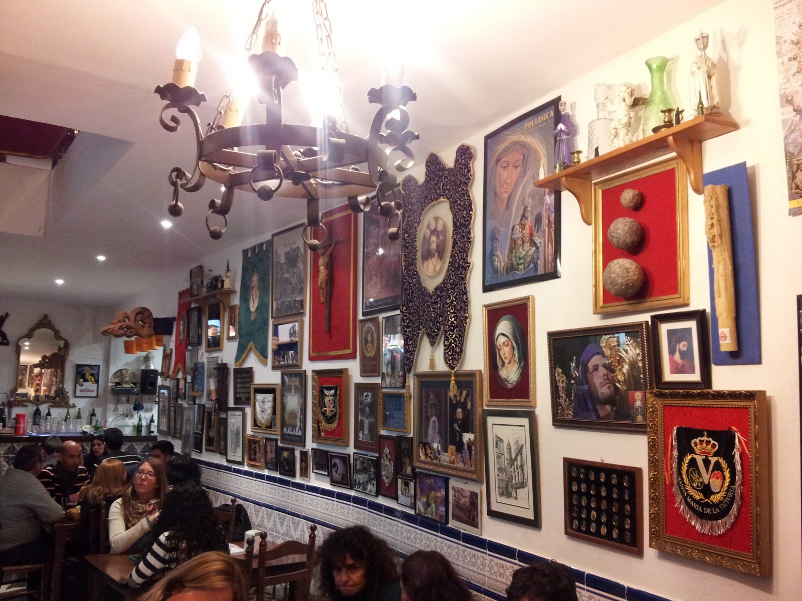 More worth it for the atmosphere and the decor than the tapas. They are cheap, so have a caña and whatever takes your fancy whilst admiring the walls and statues adorning this traditional bar. Everything is themed around the ‘Semana Santa’. (Holy Week) Worth to pop in and have a look at least once!