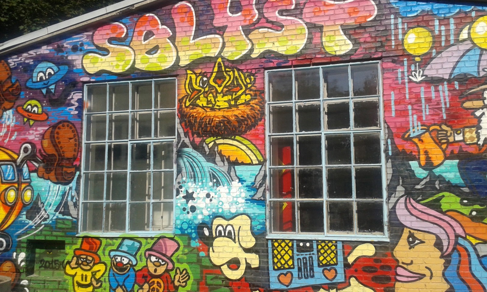 We start our tour with the main buildings of Christiania, in the centre of the community. It’s an eclectic mix of galleries, music venues, bars, eateries, a local grocery shop and graffiti adorned walls. The cafés and restaurants cater for a multicultural public: Thai, veggie, burgers, … you won’t go hungry in Christiania and it’s a lot cheaper than eating out in other areas of Copenhagen! It’s a busy and very lively area that does give you the impression of being in a hippie community. The inhabitants are used to seeing tour groups so they don’t mind cameras, as long as you don’t take photographs on the main drag of Pusher street, the place where soft drugs are sold. Cannabis is still illegal in Denmark, so the dealers often wear hoodies and scarfs not be recognized.